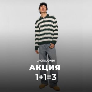 Отличная новость для тех, кто любит выгодные покупки: в JACK&JONES стартовала акция 1+1=3! При покупке двух товаров третий вы получаете в подарок — с равной или меньшей стоимостью.